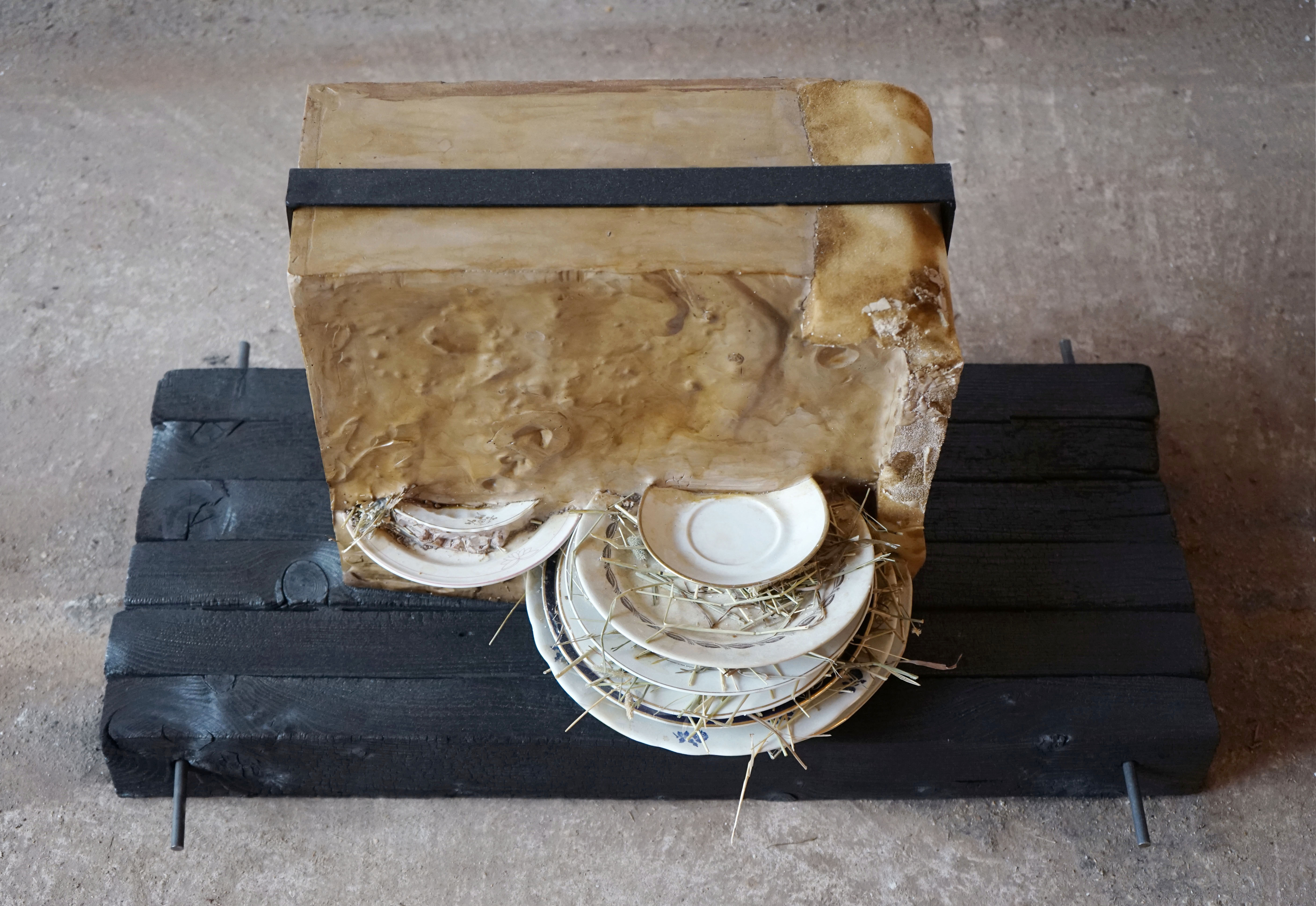 Plaster, burnt wood, wood, jute carpet, hay, porcelain, shellac